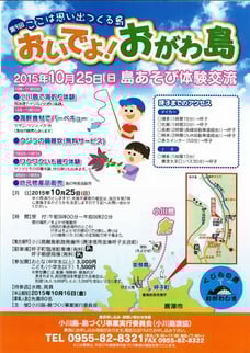 2015/10/25 島あそび体験交流「おいでよ!おがわ島」が開催されました こちらのイベントは定員に達しました。 10月25日(日)に、「第9回 ここは思い出をつくる島 おいでよ小川島」が開催されました。 海釣り体験、海鮮食材バーベキュー、クジラの鍋雑炊など盛りだくさんのイベントでした。 おいでよ!おがわ島 島あそび体験交流チラシ 20150918195749.pdf PDFファイル 287.0 KB ダウンロード tagPlaceholderカテゴリ: イベント