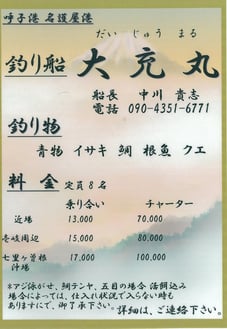 小川島周辺の近場から福岡県や長崎県の海域までで釣り船をやっています。釣物は、唐津くんちで有名なクエやブリなどの青物、アラカブなどの根魚、イサキ、鯛 などです。クエは 40kg以上の大型も釣れることもあり、その引きは想像を絶するものがあります。