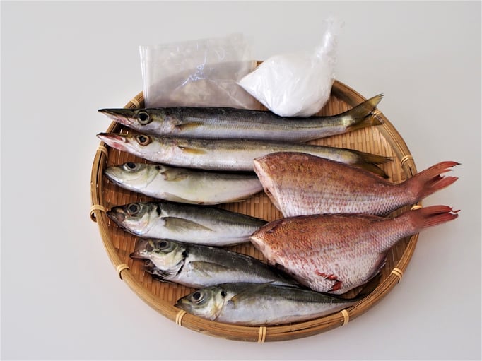 4 キット内容 マアジ4匹、アカカマス2匹、マダイ1~2匹、塩、ピッチトシート(水分を吸収するシート、作り方説明書)